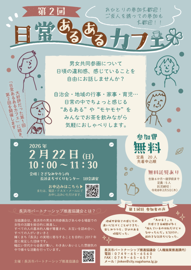 私たちと共に学び、⽇頃の思いを語り合いながら、すべての人がいきいきと輝く男⼥共同参画社会の実現を⽬指しませんか?性別・年齢は問いません。当協議会や事業に興味がある方、ぜひ事務局までお気軽にお問い合わせください。あなたの参加をお待ちしています。